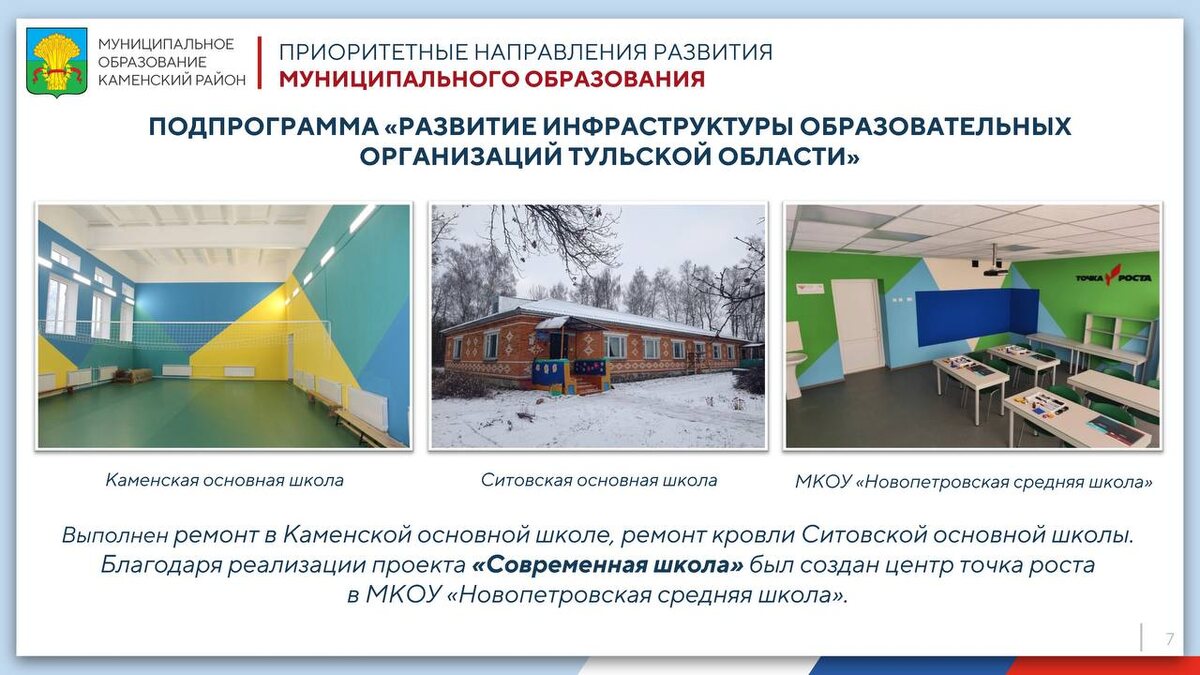 Об этом, в среду, 18 декабря, шла речь в ходе рабочей встречи губернатора Тульской области Дмитрия Миляева и глава Каменского района Светланы Карпухиной. В рамках подпрограммы «Развитие инфраструктуры образовательных организаций Тульской области» отремонтирована Каменская основная школа, а также завершен ремонт кровли Ситовской основной школы. А в Новопетровской средней школе появилась «Точка роста». Для её открытия был выполнен ремонт помещений и приобретено оборудование, мебель для оснащения двух зон. Кабинеты химии и биологии были также переоформлены, оснащены мебелью и новым оборудованием. Всё это позволит ребятам расширять свой кругозор и активнее включаться в учёбу как на уроках, так и в рамках внеклассных занятий. Количество благополучателей – 1500 человек. Это не только школьники, но и их учителя и родители.