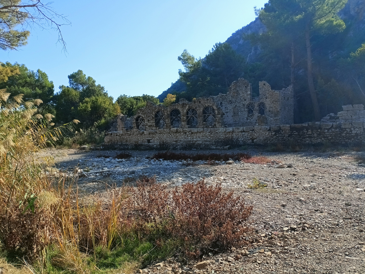 Можно догадаться, что вы вряд ли когда-нибудь слышали об этом названии. В провинции Анталья, в 90 км от центра города, неподалеку от небольшой деревни Чиралы находится очень живописный исторический объект - руины античного города Olympos, или на русский манер, просто Олимп. Дорога к Олимпу, надо сказать, не лишена природной красоты. Но вот добираться по ней - то ещё приключение! Нужно свернусь с основного шоссе у побережья, и долго-долго спускаться вниз по извилистой и узкой горной дороге, которая дает крен почти под 90 градусов, чтобы в конце концов оказаться в долине реки у подножья гор. Затем эту реку нужно вброд пересечь на машине, потому что моста нет. Хорошо, что в это время года она пересыхает, как на фото выше. В этом месте навигация на картах сходит с ума и не может точно определить, где вы находитесь. Когда же вы наконец оказываетесь у главного входа в Олимпос, выясняется, что их было два. Один находится в густой лесной местности у подножья гор. Второй - выходит прямо к Сред
