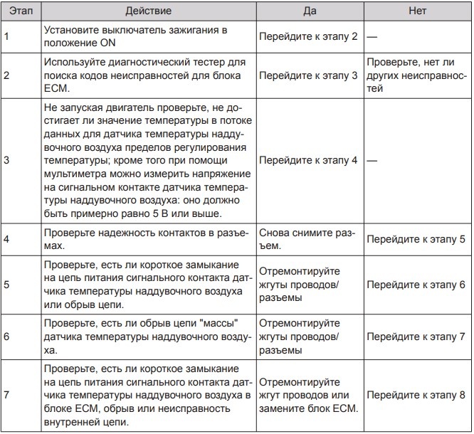 Описание диагностического кода (DTC): высокое напряжение в цепи датчика температуры наддувочного воздуха Причины появления DTC: напряжение в цепи датчика температуры наддувочного воздуха выше 4,9 В.