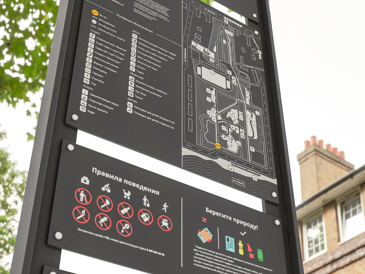 Навигация стала неотъемлемой частью повседневной жизни. От того на сколько она понятна и удобна в использовании зависит наш комфорт. Никому не хочется терять время, чтобы разобраться в сложных схемах и знаках. Именно это мы учитывали в первую очередь при разработке навигации для парка Солнечногорска. Система навигации была создана в рамках проекта модернизации Солнечногорского парка. Мы работали в сотрудничестве с компанией Mirror Group, которая занималась благоустройством парка. Так как территория парка не слишком большая и включает в себя множество зон, нам пришлось сконцентрировать графический контент на небольшой площади стелл. Стеллы были размещены рядом с этими активными зонами и на входах в парк. Всего было создано 17 отдельно стоящих стелл. Мы использовали левое и правое выравнивание названий парковых зон, в зависимости от того, в какой стороне от стеллы они находятся. Вместе со знаком направления, указанного стрелкой, такое решение дополнительно упрощает ориентацию в парке. Сх