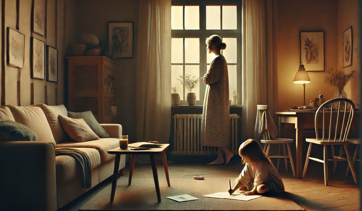 Маленькая Саша сидела на ковре и рисовала цветными карандашами. В комнате царила тишина, нарушаемая только шорохом бумаги. Её мать, Марина, стояла у окна, напряжённо смотря вдаль.