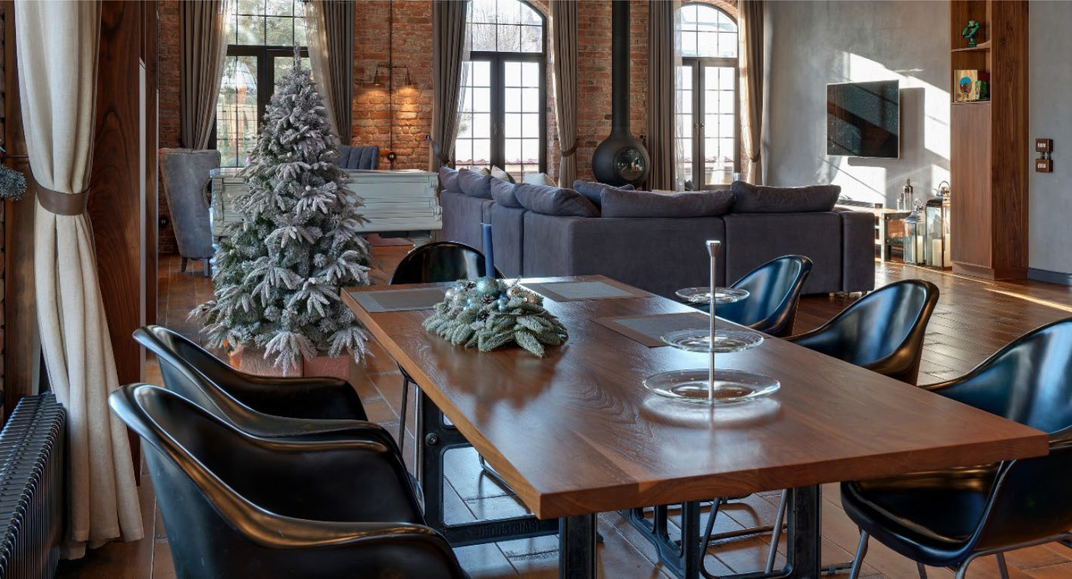 Такой интерьер подчеркивает пространство и свободу, в нем царит гармония между грубыми, неровными поверхностями и стильными декоративными элементами. В период новогодних праздников, когда хочется привнести атмосферу тепла и уюта, важно найти баланс между традиционным праздничным антуражем и характерной брутальностью лофта.