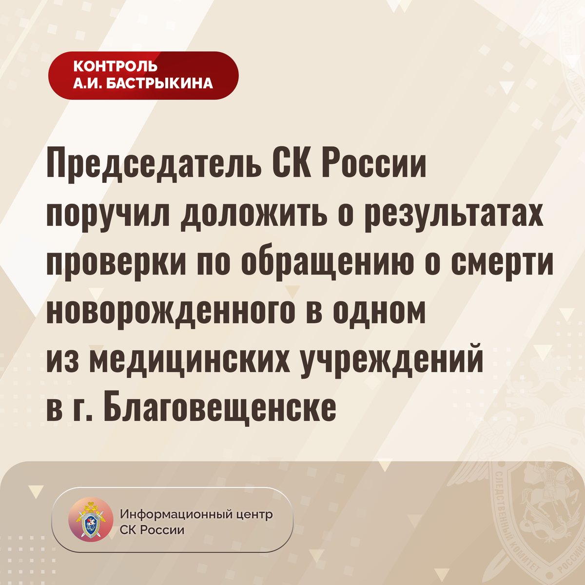 Председатель СК России поручил доложить о результатах проверки по обращению о смерти новорожденного в одном из медицинских учреждений в г. Благовещенске В Информационный центр СК России обратился житель Амурской области. В декабре текущего года супругу заявителя госпитализировали в родильный дом в городе Благовещенске. Мужчина полагает, что неверно выбранная тактика родоразрешения привела к переломам, а затем гибели ребенка. В СУ СК России по Амурской области по поступившему обращению начата процессуальная проверка. Председатель Следственного комитета Российской Федерации Александр Иванович Бастрыкин поручил руководителю СУ СК России по Амурской области Станиславу Юрьевичу Белянскому доложить об установленных в ходе первоначальных проверочных мероприятий обстоятельствах, а по завершении процессуальной проверки – о ее результатах. Исполнение поручения, а также ход процессуальной проверки поставлены на контроль в центральном аппарате ведомства. #СледственныйКомитет #СКРоссии #СКР #ИЦСКР