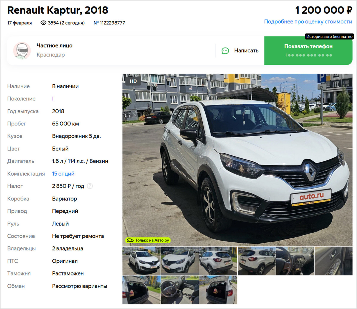 Любого покупателя подержанной машины волнует её техническое состояние — и продавцы обычно всячески убеждают его, что автомобиль исправен. Но как доказывает рубрика «Не бит, не крашен», в первую очередь стоит изучать его историю. Ведь в ней могут обнаружиться настолько неприятные сюрпризы, что всё остальное уйдёт на второй план. Сегодня будем разбираться с прошлым популярного кроссовера Renault. Белый Kaptur 2018 года выпуска предлагают в Краснодаре за 1,2 миллиона рублей. В ПТС — два владельца, на одометре — 65 тысяч километров. Звучит заманчиво, не так ли? Выглядит паркетник неплохо, а никаких цепляющих взгляд деталей на фотографиях нет. Ну а продавец утверждает, что перед нами «отличный высокий внедорожник» с «родным пробегом». Renault Kaptur 2018 г.в., отличный высокий внедорожник, оригинальный ПТС, родной пробег, ходовка как новая, двигатель работает тихо без посторонних шумов, лобовое стекло без сколов и трещин, кнопка start, установлена сигнализация, хорошая резина, литьё, возмож