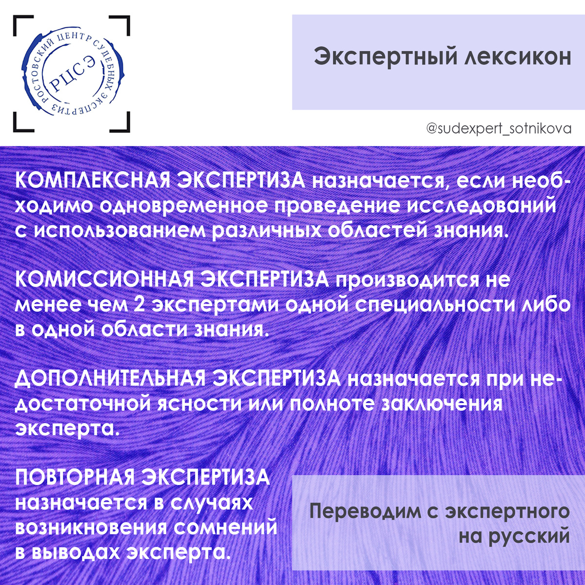 - Вам назначили «комиссионку»? А как это? - Чем отличается дополнительная экспертиза от повторной? - А комплексная экспертиза – это что-то вроде поливитаминок, да? Господа, сейчас все объясню! ✅ КОМПЛЕКСНАЯ ЭКСПЕРТИЗА назначается, если установление обстоятельств по делу требует одновременного проведения исследований с использованием различных областей знания или с использованием различных научных направлений в пределах одной области знания. ✅ КОМИССИОННАЯ ЭКСПЕРТИЗА производится не менее чем 2 экспертами одной специальности либо в одной области знания. Если по результатам проведенных исследований мнения экспертов по поставленным вопросам совпадают, то ими составляется единое заключение. В случае возникновения разногласий каждый из экспертов дает отдельное заключение по вопросам, вызвавшим разногласие. ✅ ДОПОЛНИТЕЛЬНАЯ ЭКСПЕРТИЗА назначается при недостаточной ясности или полноте заключения эксперта, а также при возникновении новых вопросов в отношении ранее исследованных обстоятельств