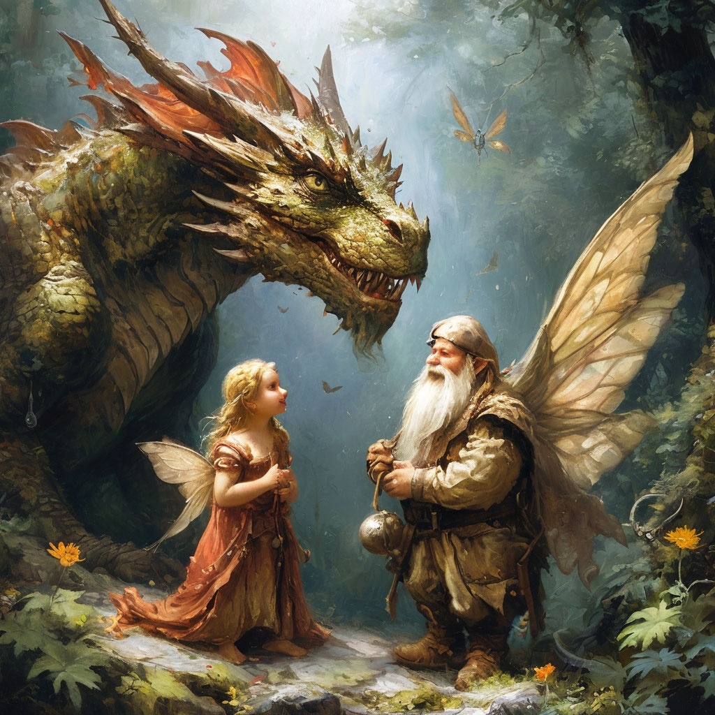 В далёком-далёком королевстве, где магия и чудеса были обыденностью, жили три необычных друга: дракон по имени Огненный Ветер, гном по имени Каменный Кулак и фея по имени Лучезарная Лилия. Огненный Ветер был самым могущественным драконом в королевстве. Его чешуя сверкала, как золото, а дыхание было столь горячим, что могло расплавить даже самые твёрдые камни. Но несмотря на свою силу, Огненный Ветер был добр и справедлив. Он всегда помогал тем, кто нуждался в помощи, и защищал королевство от врагов. Каменный Кулак был самым мудрым гномом в королевстве. Он знал все секреты подземелий и мог найти сокровища даже в самых тёмных уголках. Каменный Кулак был невысокого роста, но его сила была невероятной. Он мог поднять огромный камень одной рукой и использовать его как оружие в бою. Лучезарная Лилия была самой красивой феей в королевстве. Её крылья сверкали, как звёзды на ночном небе, а её магия могла исцелить любую рану. Лучезарная Лилия была доброй и заботливой. Она всегда помо