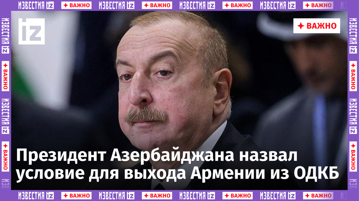Президент Азербайджана Ильхам Алиев заявил, что Армения выйдет из Организации Договора о коллективной безопасности (ОДКБ), когда получит отмашку из Вашингтона. Об этом он рассказал в интервью ВГТРК и «РИА Новости». «Армения понятно, куда идет. Она из ОДКБ де-факто вышла. По нашим данным... единственная причина, по которой они не выходят де-юре, — потому что они еще не получили отмашки из Госдепа. Как только получат, они выйдут», — сказал он. ОДКБ — это региональная межгосударственная организация, которая состоит из шести стран бывшего СССР: Армении, Белоруссии, Казахстана, Киргизии, России и Таджикистана. Основная цель ОДКБ — защита стран-участниц от внешнего вооруженного нападения. В ноябре в парламенте Армении оценили вероятность выхода страны из ОДКБ. Пресс-секретарь спикера парламента Армении Мовсес Арутюнян заявил, что армянская сторона заморозила свое участие в ОДКБ, и по данному вопросу их позиция осталась без изменений. До этого, в сентябре, в Армении заявили об угрозе суверени