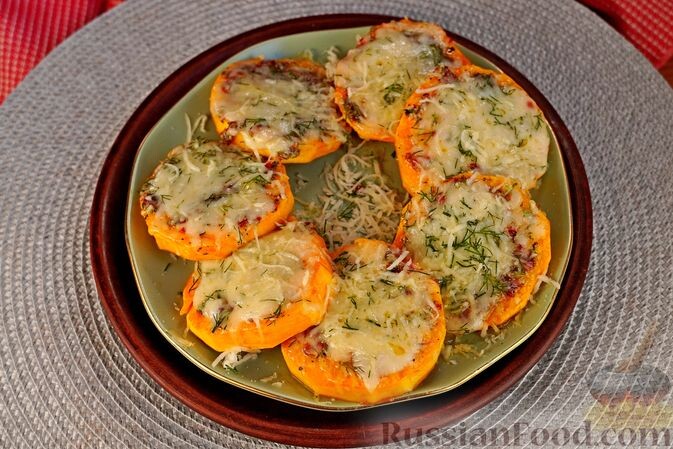 Запечённая тыква с сыром. Кружочки тыквы, смазанные ароматным маслом с пряностями и чесноком, запекаются в духовке. Степень мягкости тыквы можно выбрать по своему желанию. Затем тыква посыпается тёртым сыром с укропом. Если смешать несколько видов сыра, вкус блюда станет более изысканным.
