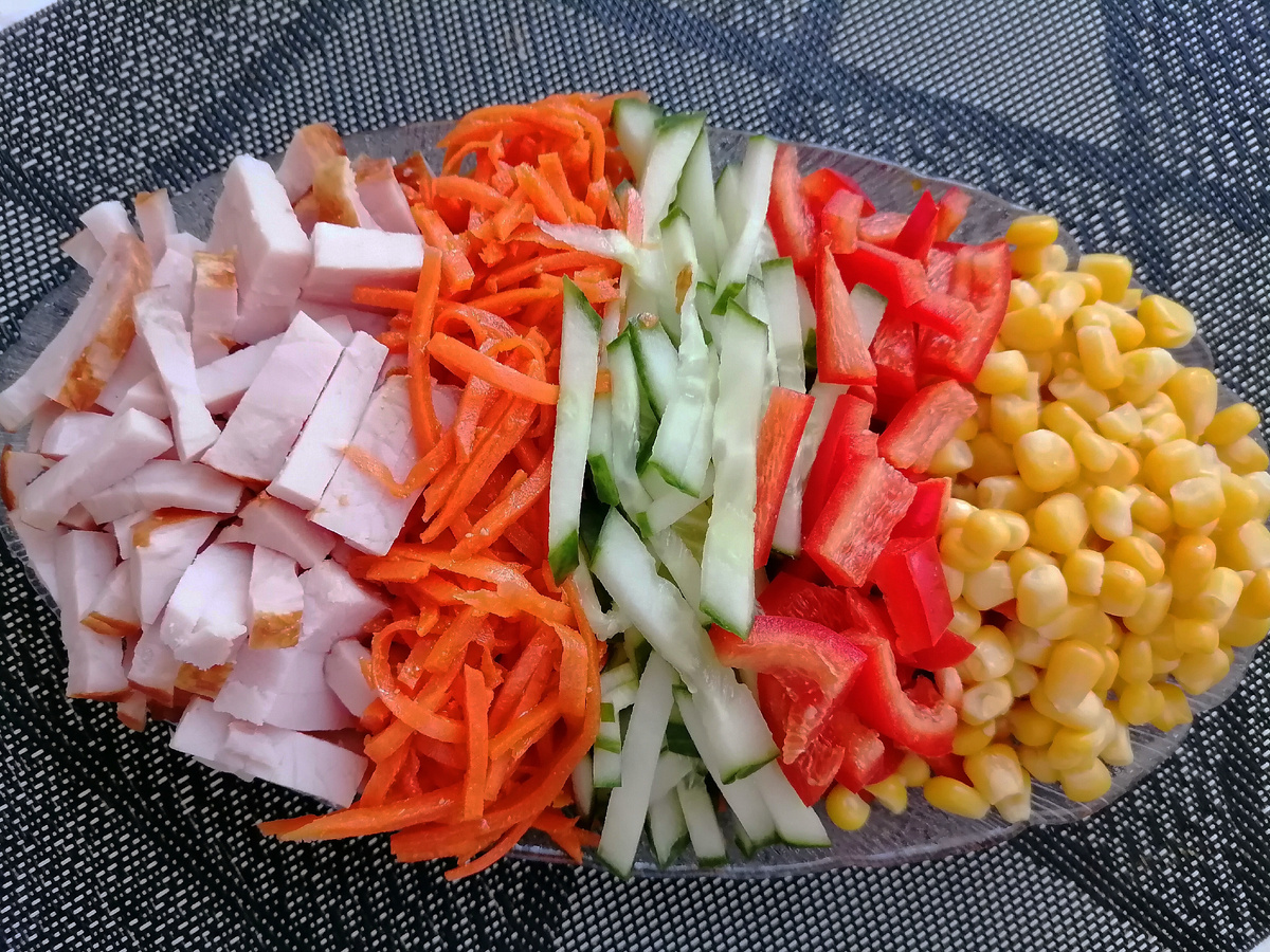 Всем добрыйобрый день! Сегодня хочу поделиться с вами рецептом очень вкусного и лёгкого в приготовлении салата. Название салата полная импровизация, поскольку не знаю как он правильно называется. В нашем семье его как-то приготовила тётя , с этого дня мы и называем его так. Ингредиенты: Заправка : майонез. Карбонад и свежий огурец нарезаем соломкой ( можно кубиком), болгарский перец кубиками. И начинаем выкладывать салат на тарелку : карбонад+ морковь по-корейски+огурец+перец+кукуруза. Между ингредиентами можно посыпать семечками. Я забыла их купить, поэтому на фото их нет. Также между ингредиентами можно провести полоски майонезом и сверху семечки. Любо просто запрвить майонезом и всё перемешать. Салат очень вкусный, нравится всем гостям, даже привередам. Граммовку не прописывала , потому что всегда делаю на глаз. Приятного аппетита!