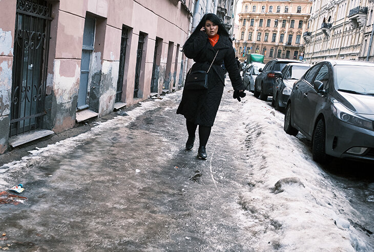 Иногда гололед может скрываться под толщей снега, поэтому в запорошенных местах лучше идти по чужим следам, избегая непонятных участков. Это важно еще потому, что, помимо сколькой поверхности, под снегом могут скрываться ямы, канализационные люки и лужи.