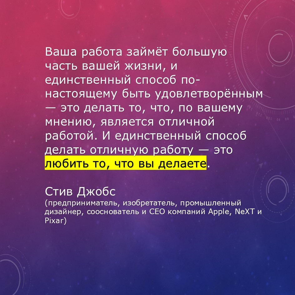 и единственный способ по-настоящему быть удовлетворённым — это делать то, что, по вашему мнению, является отличной работой. И единственный способ делать отличную работу — это любить то, что вы делаете. Стив Джобс