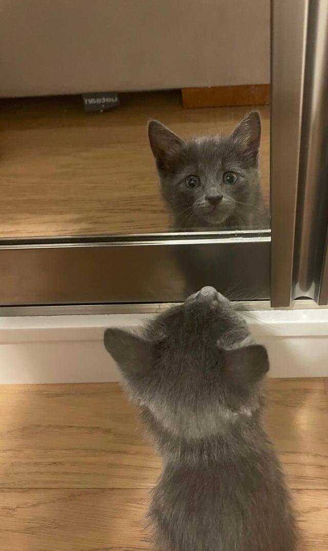 - Мама, а кто это там за стеклом? - Это ты, Пушистик. А стекло называется зеркалом. Ты видишь в зеркале своё отражение. Пушистик был удивлён. Зеркало стало для него открытием. - Надо же, и носик мой, получается, и ушки? - Ага. Это ты. Пушистик ещё долго разглядывал себя в зеркале. Он рос потихоньку и частенько смотрелся в зеркало. А потом он сделал вывод. - Мам, а я, оказывается, красивый! 😺 - А я что говорила.