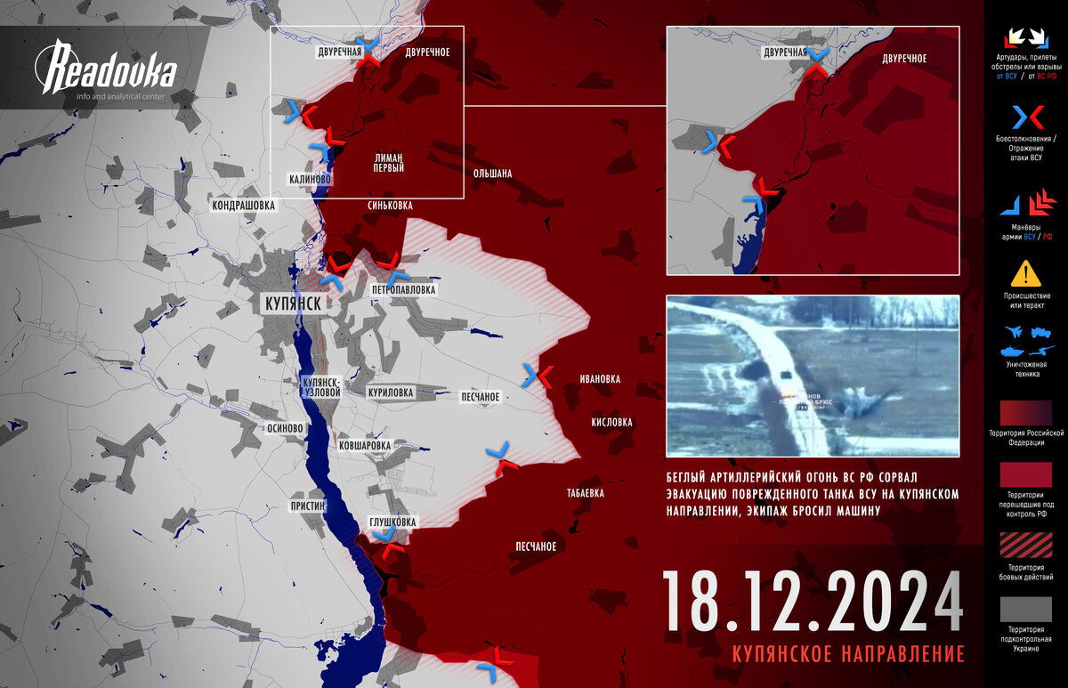 Редакция Readovka собрала самые важные события 18 декабря в разрезе СВО. Русские войска, форсировавшие Оскол у пгт Двуречная, увидели нетипичную картину – сопротивления ВСУ в поселке как такового нет. СБУ судорожно начала проводить противодиверсионные мероприятия в правительственном квартале Киева, опасаясь возмездия за убийство генерала Кириллова. В реестр террористических организаций внесли российское отделение «Аум Синрике» (террористическая секта, запрещенная в РФ)..