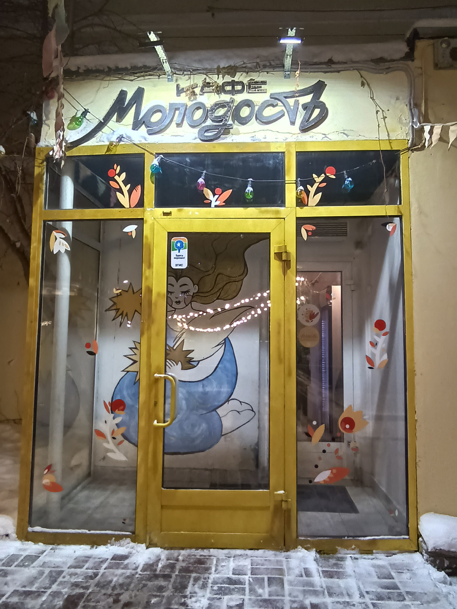 "Молодость" Подожди куда ты, Подожди куда ты, Молодость моя... Слова песни "Дайте танк" идеально описывают ситуацию: "Молодость закрывается", а мне этого сильно не хочется. Название заведения полностью оправдано. Это правда молодёжное место. Средний возраст клиентов, по моим расчётам – 25 лет (и это он значительно поднялся из-за двух взрослых мужчин, забредших на бизнес-ланч!). Я считаю, это совершенно не значит, что взрослым людям сюда идти не стоит, наоборот, им будет интересно побывать в чуть другом формате заведений! Расскажу, что вас тут ждёт. "Молодость" - это уютное, приятное и очень маленькое местечко, причём настолько маленькое, что я вообще не поняла где готовят. Видимо кухонка 2 на 2, потому что здание крайне небольшое. Здесь есть несколько столиков разного калибра, некоторые из которых расположены рядом с ламповым диваном на котором лежат подушки и игрушки. Также есть несколько мест у барной стойки, хотя алкогольное меню, ради которого, как мне кажется, садятся у бар