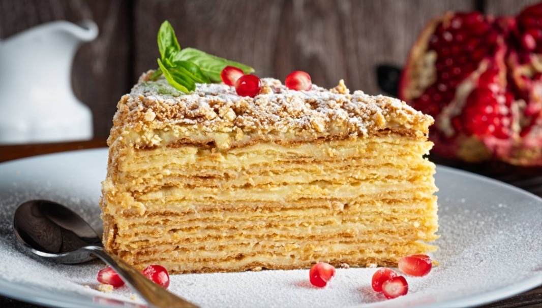 История торта «Наполеон» запутанна и опирается на несколько легенд. По одной из версий, идея многослойного десерта возникла во Франции в 1645 году у кондитера Клавдия Геле.Рецепт был украден итальянцами именно они придумали пропитывать слои теста заварным кремом и назвали его Napolitano.в таком новом виде его привезли обратно во Францию и переименовали «Королевскую галету». В Россию название Наполеон пришло вместе с беглыми французским аристократами, во время Французской революции. По другой версии сам Наполеон Бонапарт придумал этот рецепт. По легенде Наполеон флиртовал со служанкой, его жена потребовала объяснений. Он сказал что всего лишь подсказывал рецепт торта.И на следующий день торт был подан к королевскому столу. Третья версия: гласит, что в XIX веке известный парижский кондитер Мари-Антуан Карем ввёл в моду десерт со сливочным кремом под названием Мillefeuille (от фр. «тысяча слоёв»).Русским кулинарам рецепт быстро стал известен о нем есть даже упоминание в художественной