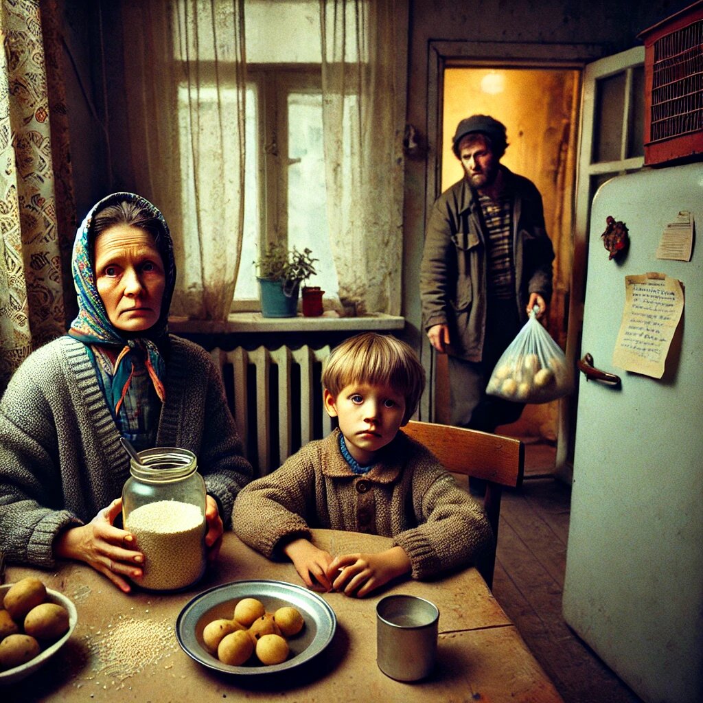— Мам, а почему мне нельзя на площадку вместе с друзьями? — спросил Серёжка, смотря на маму с огромными глазами. Катя отвернулась, зажимая руками банку с перловкой. В гостиной разложена раскладушка для дяди Гены, а на холодильнике висит записка: «Денег на хлеб в конце недели не хватит». — Понимаешь, Серёжа, у меня нет нормальных ботинок для тебя, а во дворе грязь. Ещё заболеешь, — объяснила Катя. Мальчик нахмурился, но кивнул. Дверь поддалась со скрипом. Вошел отец с мешком картошки. — Катюша, я знаю, что нелегко. Давай попробуем что-то придумать. Катя вздохнула: — Придумать? Я уже на трёх работах. Уборщица, продавщица на рынке и подработки у соседей только чтобы купить еду на неделю. А обувь... Серёже в школу скоро, у него вся обувь уже совсем плохая. — Держитесь, — твёрдо сказал Геннадий. — Я тут договорился. Завтра к знакомому заедем. Он сапожник, обещал помочь с обувью. Катя посмотрела на брата и вдруг почувствовала тепло. В эти времена любой жест поддержки был на вес золота. Утро