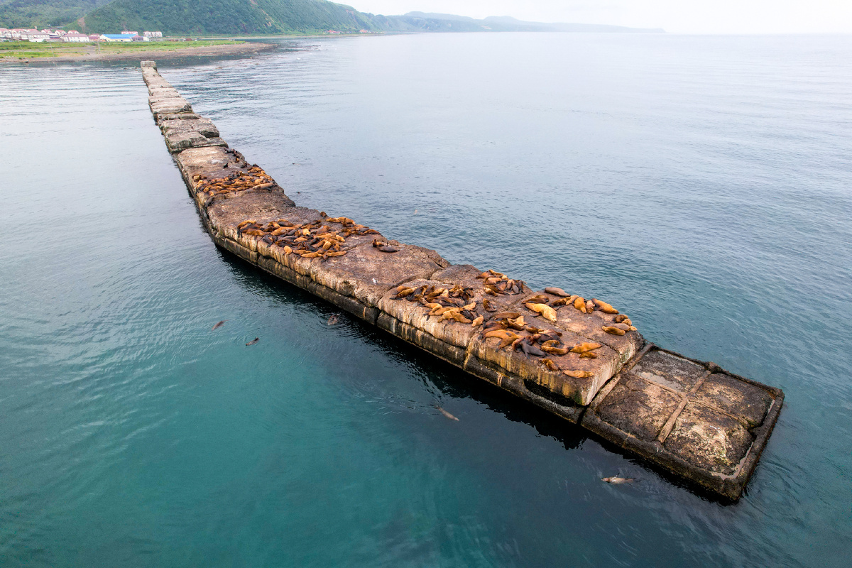 Ветер, шепчущий истории моря, принесенные с далеких берегов, истории о штормах и затишьях, о морских путешествиях и забытых кораблях, гуляет над старым бетонным брекватером. Этот рукотворный остров, вытянувшийся в море, сложенный из бетонных плит, словно руины забытой цивилизации, стал пристанищем гигантов северных морей — сивучей. Старые бетонные плиты, пропитанные солью и выбеленные солнцем, словно древние скалы, обтесанные волнами времени, покрытые узорами из водорослей и ракушек, стали их домом, их крепостью, защищающей от бурь и непогоды.