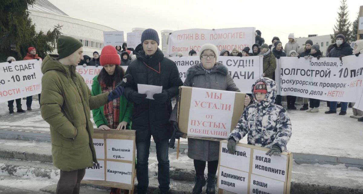 Дольщики долгостроя на улице Тополевой, 5 в Новосибирске уже 10 лет не могут дождаться своих квартир. За помощью они обратились к президенту России Владимиру Путину. Пикет с обращением прошел 15 декабря около театра «Глобус». На видео, которое оказалось в распоряжении Сиб.фм, обманутые дольщики, среди которых участники специальной военной операции, заявили, что власти и застройщик не выполняют свои обещания. «Обещания не выполнены» «Уважаемый Владимир Владимирович, мы, пострадавшие дольщики строительного объекта по адресу город Новосибирск, улица Тополевая, 5, обращаемся к вам с просьбой о помощи. Этот дом должен был быть сдан еще в 2014 году, но до сих пор не достроен. В строительстве участвуют 200 семей, в том числе действующие участники СВО. Мы заплатили свои деньги за апартаменты, которые рекламировались как жилое помещение, но остались без жилья и без поддержки», — заявили дольщики. На протяжении многих лет, по их словам, обращения в Минстрой, прокуратуру и администрацию не дали р