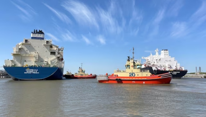 Танкер для перевозки СПГ направляется буксирами на экспортном предприятии СПГ Cheniere Sabine Pass в округе Кэмерон, штат Луизиана, США, 14 апреля 2022 г. REUTERS/Marcy de Luna