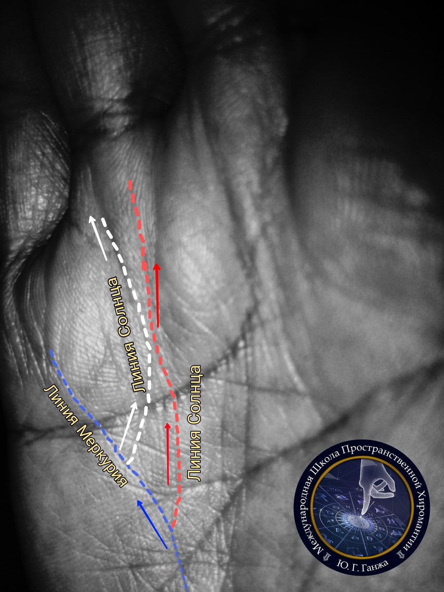Знаков финансовых перспектив на руке масса, они также имеют свои противоречия, многие вызывают споры и разногласия. 🚩Я хочу продемонстрировать очень работающую схему, которая встречается на практике. Впервые я с ней познакомилась конечно в нашей школе Международная Школа Пространственной Хиромантии И вот она стала все чаще попадаться мне на глаза. Рассмотрим два ее варианта. ✅На рисунке изображена линия Меркурия, от которой словно лучи исходят линии, направленные в сторону холма Аполлона и носящие характеристики линий Солнца. 🖍Одним из показателей линии Меркурия является финансовый стержень нашей жизни. 🖍Ветви, исходящие от линии Меркурия в сторону линии Солнца демонстрируют радость, от финансовых поступлений. Точки их истока это и есть возраста денежных потоков по Меркурианской шкале времени. Те самые моменты, которые позволяют Вам чувствовать себя увереннее и финансово защищеннее, стабильнее в жизни. ❗Важно. В таком случае линии имено исходят от линии Меркурия в нап
