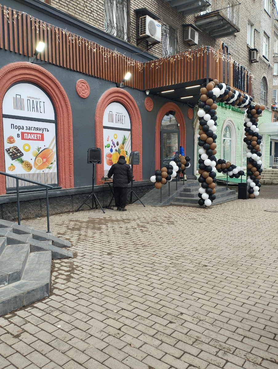 Внимательные читатели моего канала, вероятно, вспомнили похожее фото. Действительно, это уже знакомый им бульвар Шевченко в Донецке, где неожиданно для меня началось строительство сразу двух объектов на первом этаже огромной сталинки, которая в пятидесятые годы прошлого века украшала одну из главных автомагистралей города: Работы здесь велись очень быстро. И, как и можно было предположить, в канун Нового года сначала открылся всё-таки новый офис банка: А новый супермаркет новой для Донецка сети Пакет на два дня отстал. Но сегодня, в отличие от Сбера, здесь устроили очень шумное открытие. С шариками, которые и посетителям раздавали, с громкой музыкой и с молодыми людьми, привлекавшими внимание водителей. К моему удивлению ажиотаж был немалый, невзирая на то, что совсем рядом находятся еще два супермаркета. Покупатели мгновенно заполнили небольшой торговый зал. Разглядывали выставленные на полках товары. При этом самое большое внимание уделяли вовсе не этой продукции. А выбор здесь дово