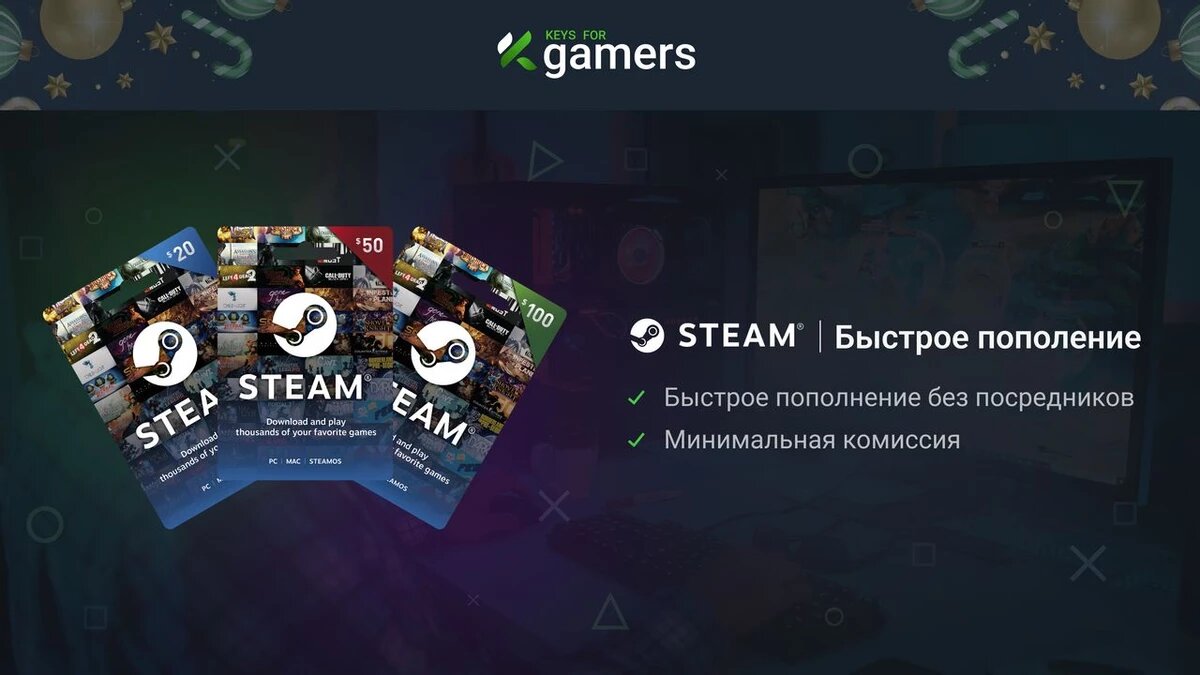 Декабрь – время чудес и подарков! Keysforgamers дарит тебе шанс порадовать себя (или друга-геймера) крутыми играми по сказочным ценам! Скидки до 70% НА ВСЕ + еще 20% с промокодом XmasBonus! А теперь у нас появилось пополнение кошелька Steam с самой низкой комиссией на рынке! Просто введи свой логин, и через 15 минут деньги будут на твоем аккаунте, регион не имеет значения. Хватит ждать чуда – создай его сам! Indiana Jones and the Great CircleMicrosoft Flight Simulator 2024S.T.A.L.K.E.R. 2: Heart of ChornobylDeadsideCall of Duty Black Ops 6DRAGON BALL: Sparking! ZEROSILENT HILL 2Farming Simulator 25Dragon Age: The VeilguardPlanet Coaster 2 EA SPORTS FC 25 Ultimate TeamElder Scrolls OnlinePath of Exile (EU)Black Desert (RU)WarframeFinal Fantasy XIVPerfect World (RU)Lineage 2 (EU/NA)World of Warcraft (EU) Nintendo Gift CardXBOX Live Gift CardsPlayStation Network Gift Card Steam Gift CardGTA Cash CardYouTube PremiumSpotifyBinanceCrypto Voucher Gift CardsSurfshark Или же пополни свой баланс