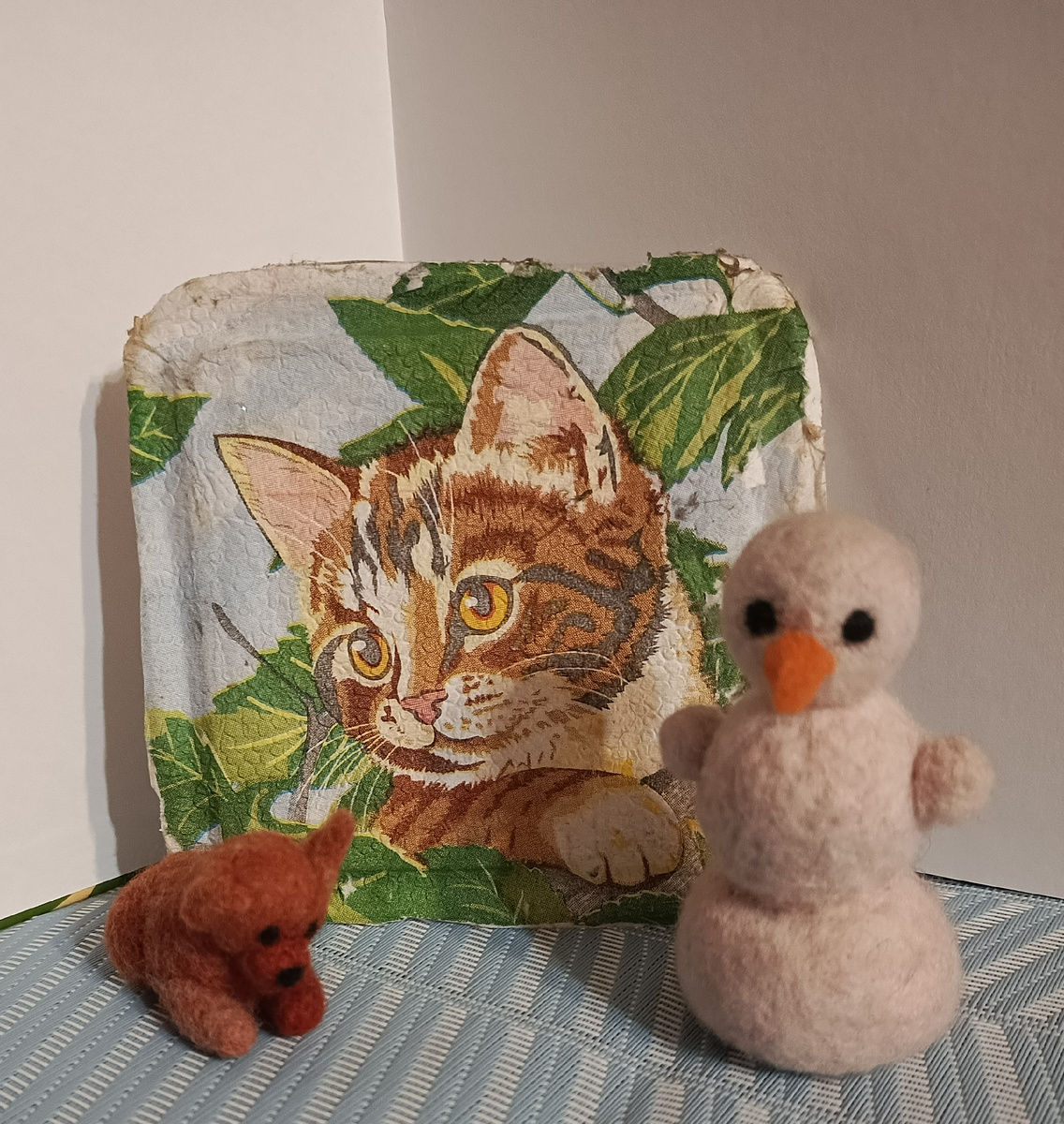И знаете, я смотрю на ее поделки и вспоминаю себя. Садовские поделки не особо помню, а вот в начальной школе я делала маме ее портрет. Перевела фотографию на фанерку и выжигала гвоздиком контур, потом раскрасила. У меня не было прибора для выжигания, гвоздик я держала плоскогубцами и раскаляла его на газовой плите. Все делалось в тайне, это же был сюрприз. А еще я ей шила кота в сапогах. Я даже помню, что он был из синего драпа, а сапоги и шляпа были красные. Мама долго его хранила, но при переезде я кота не нашла. Зато сейчас у нее на полке стоит вязаный хранитель снов. Его я ей подарила несколько лет назад когда вязала игрушки амигуруми.