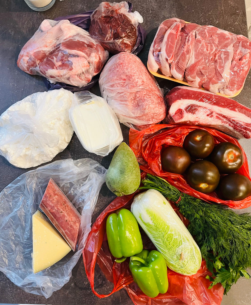 Всем большой московский привет 👋🤗.. Так убегалась—- спина отнялась))… Дома все размеренно..Там спешить некуда.. в больнице вообще дни на кровати проходили— и тут сразу московские расстояния((.. В общем встали утром с сыном.. я еще ночью плохо спала.. всегда у меня первая ночь трудная бывает))🥱.. Позавтракали, сыну надо было ехать на тренировку в спортзал, он продолжает ездить на Молодежную, где раньше жил в «Вандер парке», там у него абонемент годовалый оплачен, вот и ездит три раза в неделю. А я решила поехать с ним тоже, потому как мне нравится там небольшой рыночек в торговом центр «Трамплин», я тоже туда часто ходила со старой его квартиры. Ну и поехали вместе, он на тренировку, а я за покупками. Сначала сходила в Ашан, купила там еще сковороду и кастрюлю, а то у него посуды мало. Мужик один живет)) А потом пошла за мясом и овощами. В результате купила вот столько: Баранину, говядину, утиные ножки, индюшиную печень, фарш. Чтобы на неделю мяса хватило))😀 Ну и помимо немног
