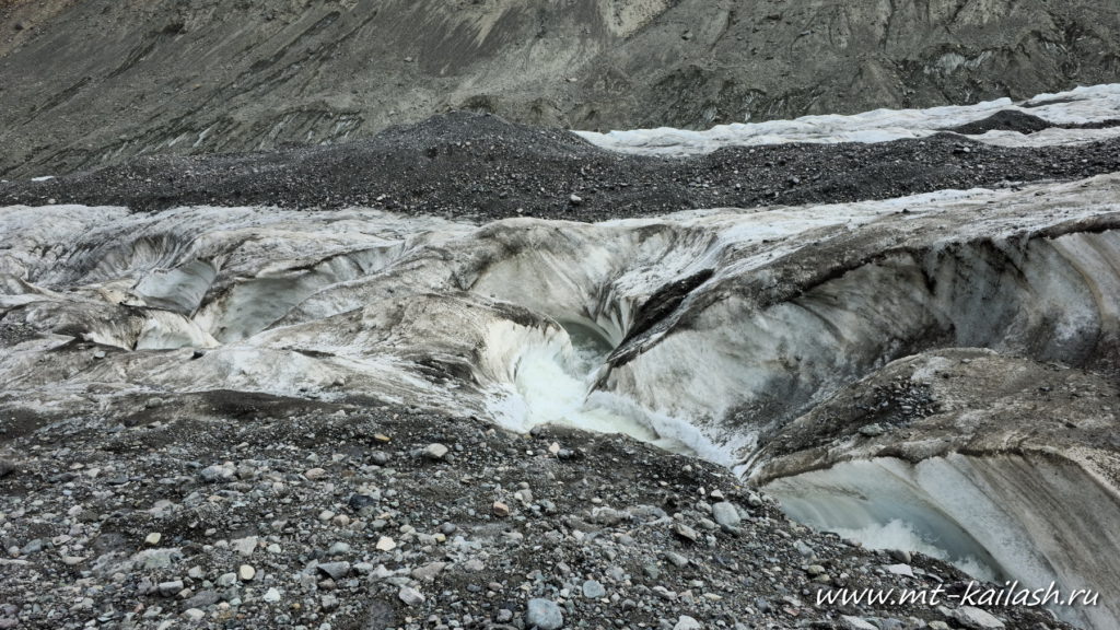 Нам удалось подойти к массиву ледника, непосредственно примыкающему к основанию С-образного Каменного Зеркала и пройти вдоль него к основанию восточной грани г. Кайлас. В этом месте ледник поднимается в высоту на 150-200 м, а его ширина составляет до 400 м. В центральной части склон ледника довольно крутой и на нем проявлены выступающие ребра изо льда, а по бокам более пологий.