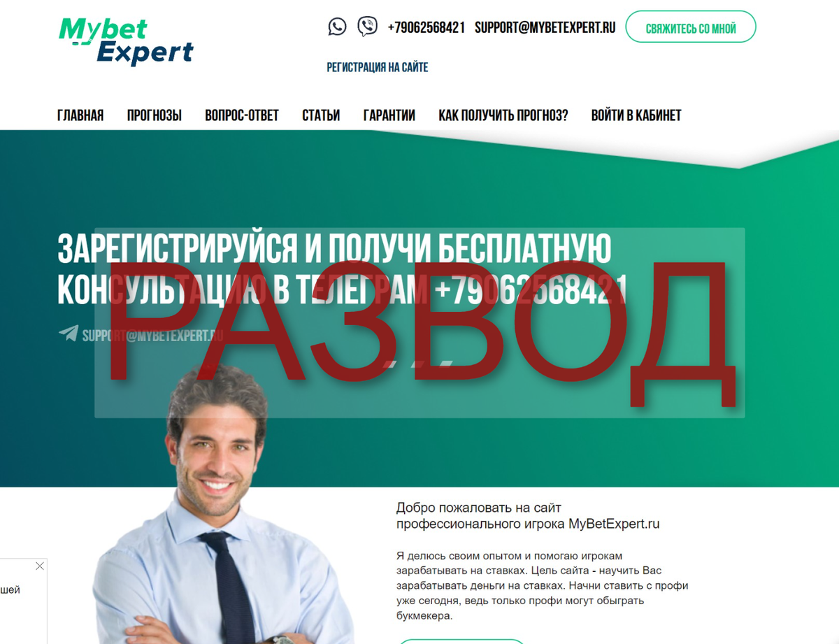 Ежедневно появляются десятки новых «экспертов», предлагающих заработать на спортивных ставках. Один из таких проектов — MyBet Expert, обещающий своим клиентам прогнозы с проходимостью от 80%. Однако по итогам анализа этот сайт был внесен в черный список из-за множества тревожных сигналов и явных признаков мошенничества. На первый взгляд, проект выглядит профессионально, но за яркими обещаниями кроется множество сомнительных моментов, которые нельзя игнорировать. Проект MyBet Expert заявляет, что предлагает клиентам заработок на ставках благодаря прогнозам с проходимостью более 80%. Вот только за этими заявлениями скрывается отсутствие реальной статистики и других доказательств эффективности. На сайте нет информации о команде капперов или их профессиональном опыте. Все контактные данные обезличены, а из инструментов связи доступны лишь электронная почта и телефон. Клиентам предлагаются: Кроме того, пользователям навязывают регистрацию на букмекерских платформах по партнерским ссылкам п