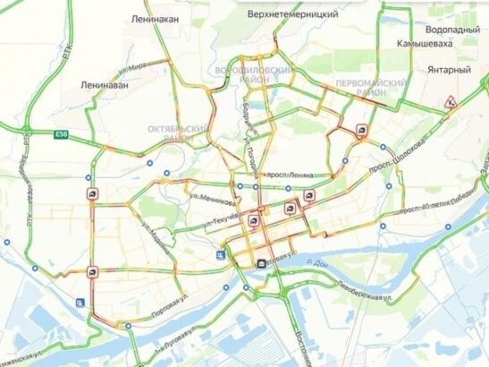 Пробка образовалась из-за шести аварий. В настоящее время наблюдаются два ДТП - на улице Красноармейской, пересечении Максима Горького и Театральной, Шолохова, кольце Текучева/Театральный проспект, а также Текучева/Ворошиловский мост.