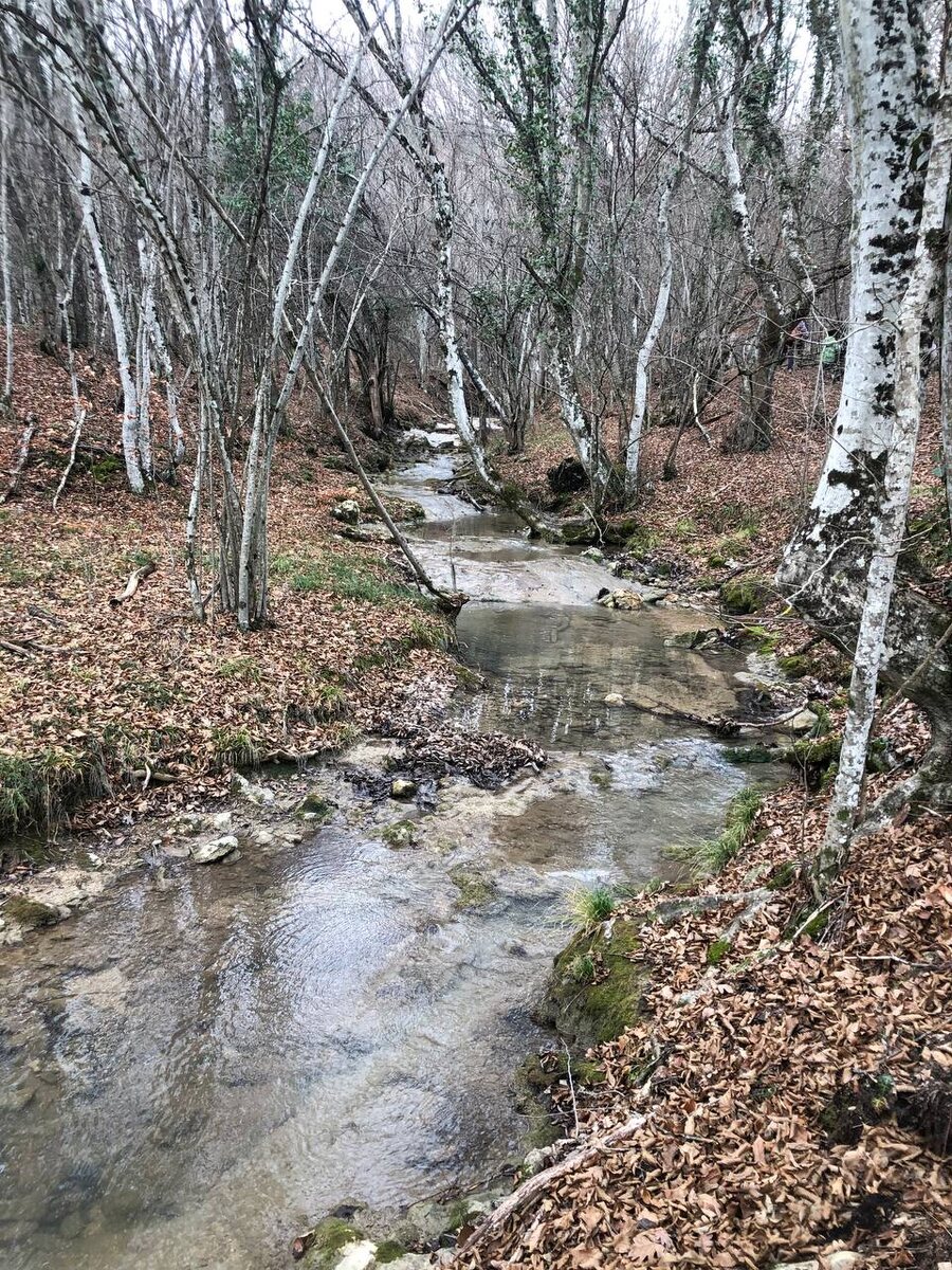 Приветствую, вас, мои читатели. Сегодня я расскажу вам о нашем походе по Байдарской долине. Наш путь начинается с посещения водопада «Козырек» находится он в урочище Колабар-Дере на речушке, протяженность которой всего 4 км. Название его связано с тем, что падение воды (более 10 метром) происходит с природного козырька, и стекает вода в кристальную, голубую «ванну» образуя маленькое озеро . Вокруг водопада есть места для отдыха или пикника. Путь к нему короткий и не сложный. Можно подняться по тропинке, и посмотреть на него с верху. Чтобы увидеть водопад Козырек в Крыму полноводным, лучше всего посетить его весной, когда в горах обильно тает снег. Но в любом случае, весной, осенью или зимой это место невероятно обаятельное, с какой-то своей таинственной магией. Ну а мы продолжаем наш поход и идем через лес к гроту Фатьма-Коба или «пещера Фатьмы». Грот Фатьма-Коба является мезолитической стоянкой. Проще говоря (а то на придумывают словей, что людЯм и не выговорить))), стоянка