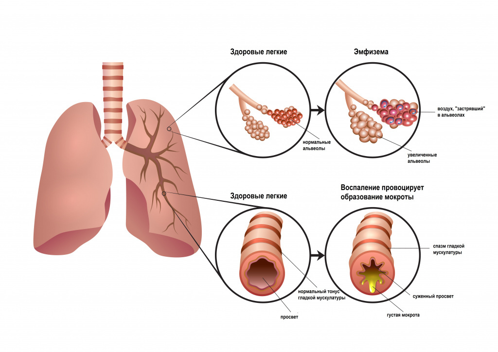Хроническая обструктивная болезнь легких (ХОБЛ) – это прогрессирующее и угрожающее жизни заболевание лёгких, которое характеризуется воспалением дыхательных путей и отёком бронхов. ХОБЛ является четвертой причиной смертности в мире. Эта болезнь не легко диагностировать, что делает её более опасной, чем можно себе представить. Это воспалительное заболевание с поражением мелких бронхов, которое приводит к нарушению дыхания за счёт сужения просвета. А со временем в лёгких развивается эмфизема. Состояние, при котором снижается эластичность лёгких (их способность сжиматься и расширяться в процессе дыхания). Лёгкие при этом находятся как будто бы в состоянии вдоха, в них всегда, даже во время выдоха, остается много воздуха, что нарушает нормальный газообмен и приводит к развитию дыхательной недостаточности. Основными причинами заболевания ХОБЛ являются: Симптомы ХОБЛ: Есть ли какое-то лечение этой страшной болезни? Во-первых, это полный отказ от курения. Без отказа от курения лечение ХОБЛ не