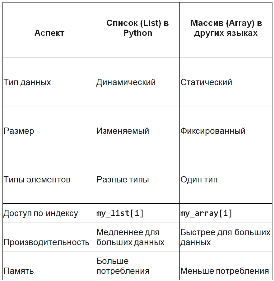 Привет, уважаемые ученики! Сегодня мы поговорим о структуре данных под названием List (список) в Python. List — это одна из самых полезных и часто используемых структур данных, которая помогает организовать и управлять информацией. Давайте разберемся, что такое List, где мы его встречаем в реальной жизни, и как работать с ним в Python. List (список) — это упорядоченная коллекция элементов, которые могут быть разного типа (числа, строки, другие списки и т.д.). Элементы списка разделены запятыми и заключены в квадратные скобки []. Массив и список — это две структуры данных, которые используются для хранения коллекций элементов, но они имеют ключевые отличия. Массив обычно имеет фиксированный размер и хранит элементы одного типа, что делает его более эффективным в терминах производительности и использования памяти, особенно для больших данных. В отличие от этого, список в Python является динамической структурой, которая может изменять свой размер после создания и может содержать элементы