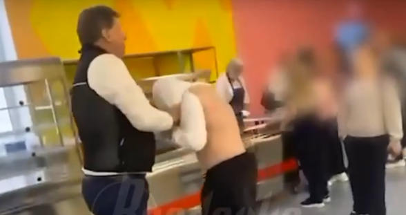 В кадре здоровый учитель физкультуры, он был разъярён, когда подросток облизавший откусанное печенье и уронивший его на пол, подал его же взрослому человеку, обедающему в школьной столовой.