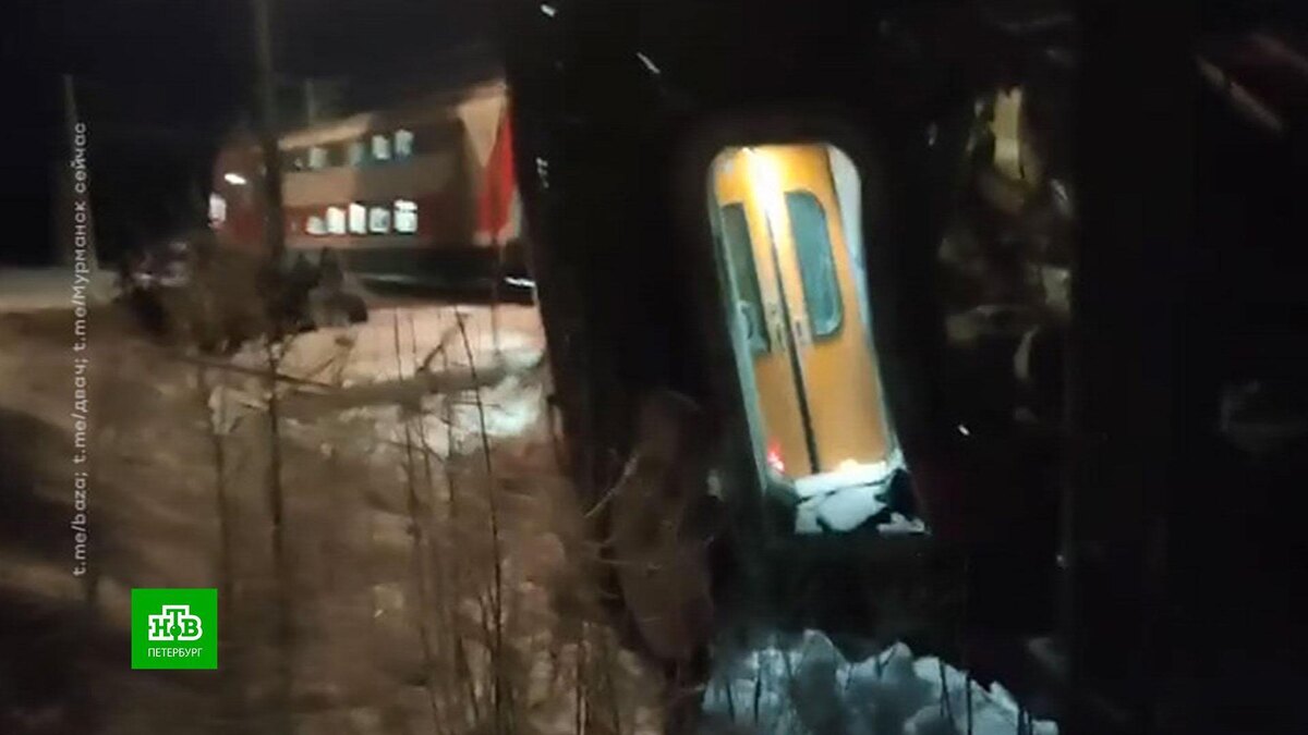 [ Смотреть видео на сайте НТВ ] В Мурманской области очевидцы сняли на видео первые минуты после столкновения грузового и пассажирского поездов. В первые минуты после ЧП пассажиры поезда Мурманск — Петербург пытались выбраться из состава. Но им не сразу это удалось, двери были заблокированы. Что случилось, люди осознали довольно быстро. На улице вагоны вперемешку с товарными лежали на путях. Основная версия произошедшего — боковое столкновение. По предварительным данным, сегодня вечером товарный состав с рудой начал двигаться самопроизвольно и врезался в шедший по параллельным путям пассажирский поезд. В итоге три двухэтажных вагона опрокинулись. Количество пострадавших растет с каждой минутой. Один человек оказался зажатым внутри вагона, минимум четверо находятся в тяжелом состоянии, включая одного проводника. Всех доставляют в Кандалакшскую центральную районную больницу. Одна из пострадавших скончалась в машине скорой помощи. Из Мурманска в Петербург в общей сложности направлялись 32