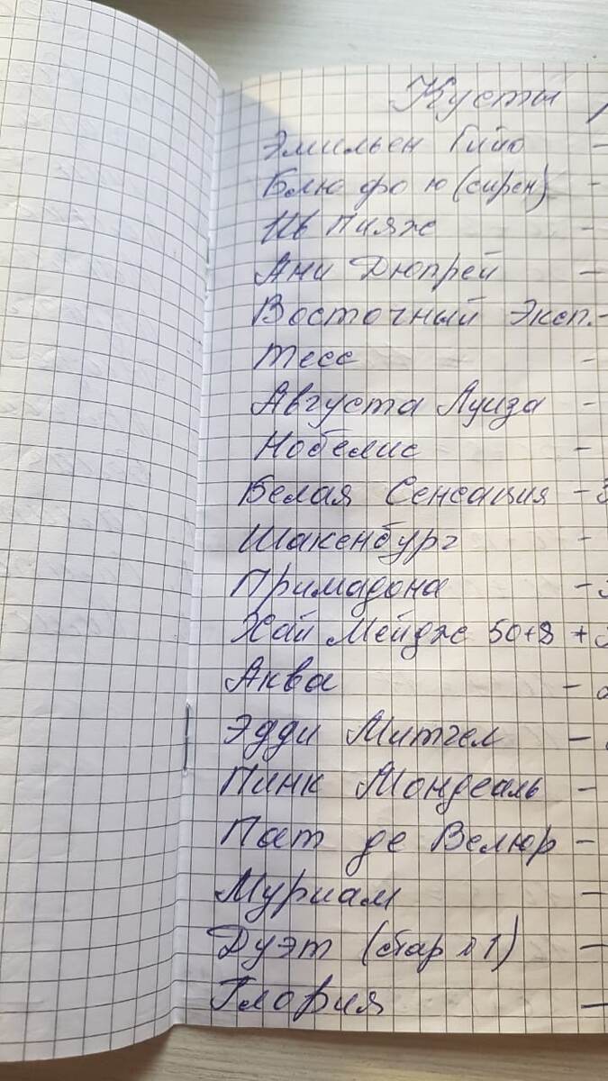 С этой розой у меня целая история вышла. Года четыре назад попалось мне в соцсетях короткое сообщение об одном начинающем производителе роз из Курска. Отзывы о саженцах были очень хорошие. И хотя дело было рискованное, я решилась: списалась с товарищем, сразу получила список имеющихся в наличии сортов. Выглядели списки вот так: