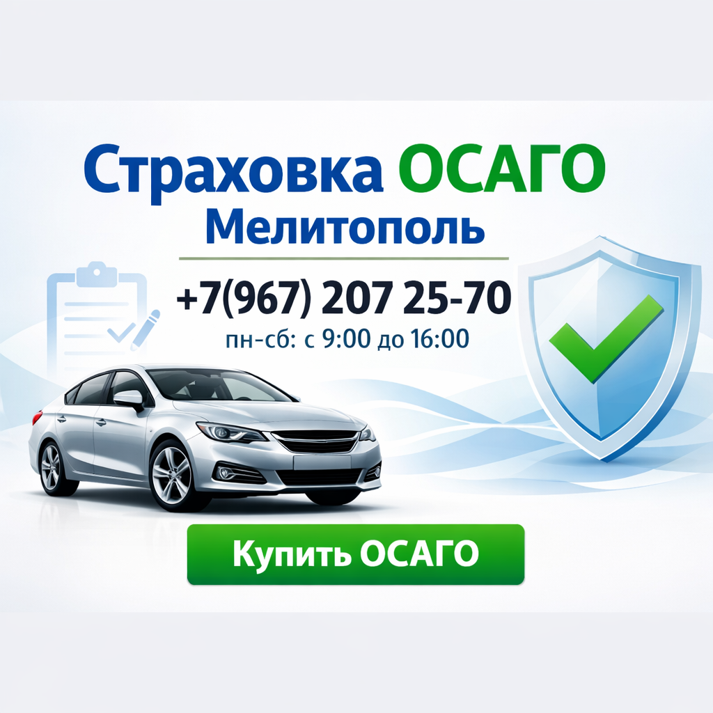 Наш офис в Мелитополе приглашает водителей оформить полис ОСАГО от ведущих страховых компаний. ✅Оформить страховку ОСАГО в Мелитополе ✅ Скидка до 30% для пенсионеров и инвалидов ✅Защита от дронов ✅Действие полиса по всей России Мы ценим ваше время и заботимся о вашем комфорте за рулем. В нашем офисе вы можете не только приобрести новый автомобиль, но и оформить обязательное страхование ОСАГО с участием ведущих страховых компаний. Мы понимаем, как важно иметь надежный страховой полис на случай дорожно-транспортных происшествий. Поэтому мы предлагаем вам сделать это быстро и удобно прямо у нас в автосалоне. Наши специалисты помогут вам выбрать оптимальный вариант страхования, подходящий именно для вас. Оформите полис ОСАГО в офисе, вы получите: - Быстрое и качественное обслуживание - Доступ к полисам от лучших страховых компаний - Профессиональные консультации по вопросам страхования Не откладывайте заботу о безопасности на дороге на потом. Посетите в Мелитополе сегодня и оформите полис