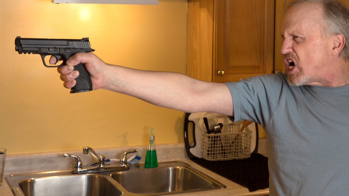 негодяй достал пистолет и стал угрожать маме, размахивая