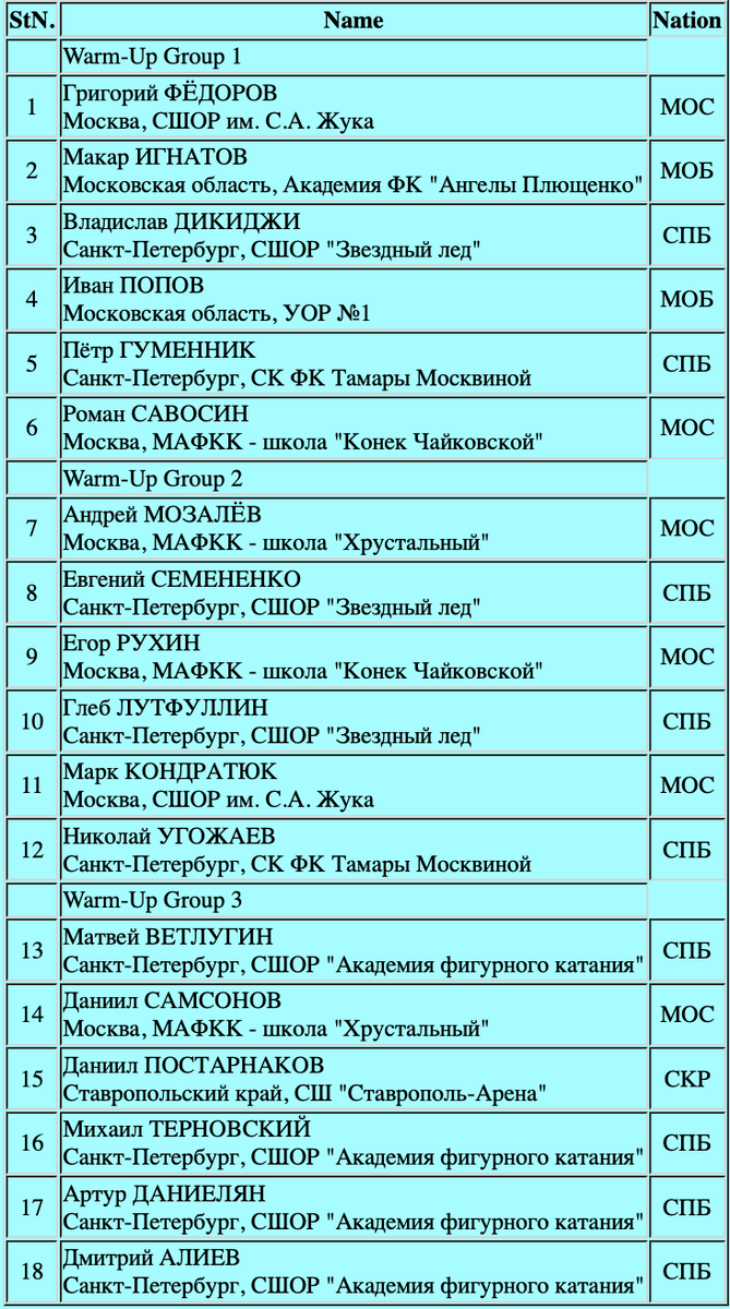 Порядок выхода участников на лёд: