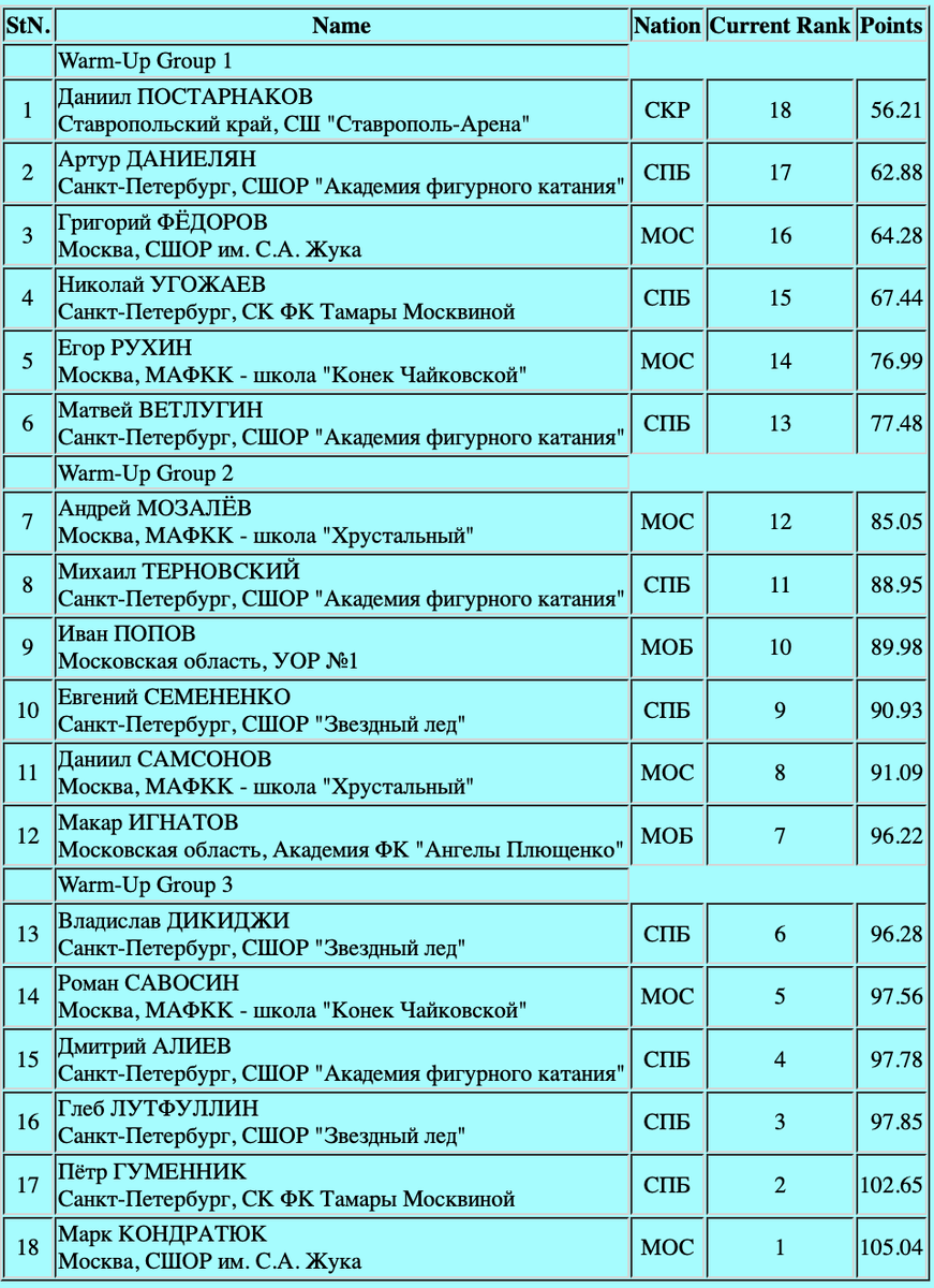 Баллы КП и порядок выхода спортсменов на лёд: