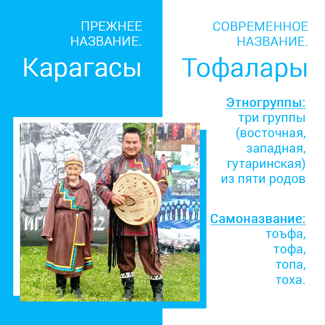 Продолжая ранее начатую тему об устаревших и современных названиях народов, знакомим с жителями Тофаларии - тофами. Тюркоязычный малочисленный народ юга Сибири тофалары до середины 30-х годов назывался карагасы. Точных сведений о происхождении такого названия нет, но на многих тюркских языках слово «кара» значит «чёрный», например Каратау (Чёрные горы), Каракум или Кара-Кумы (Чёрные пески), Карасу (Чёрная вода), каракал или кара кулак (чёрное ухо), Караколь (Чёрное озеро) и т.п. Предположительно, что «карагасы» переводится «чёрные гуси». Бывшие кочевники карагасы после перехода на оседлую жизнь стали называться тофалары, а территория их проживания переименовалась с Карагасии на Тофаларию. Причины неизвестны, но вроде бы тотемное название показалось неблагозвучным в новых условиях государства. За сказочным названием Тофалария скрывается историко-культурный, но труднодоступный регион в центральной части Восточного Саяна на западе Иркутской области России. Исследователи считают, что караг