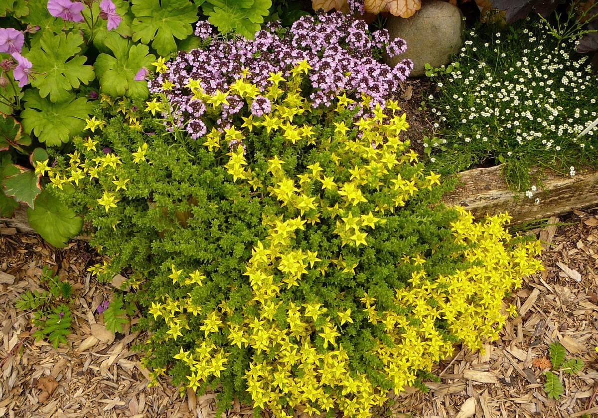 Очиток едкий образует плотные вечнозеленые коврики из зеленых листьев высотой, во время цветения сплошь покрывается мелкими желтыми цветочками. Отличается зимостойкостью, засухоустойчивостью и в целом совершенно неприхотлив.