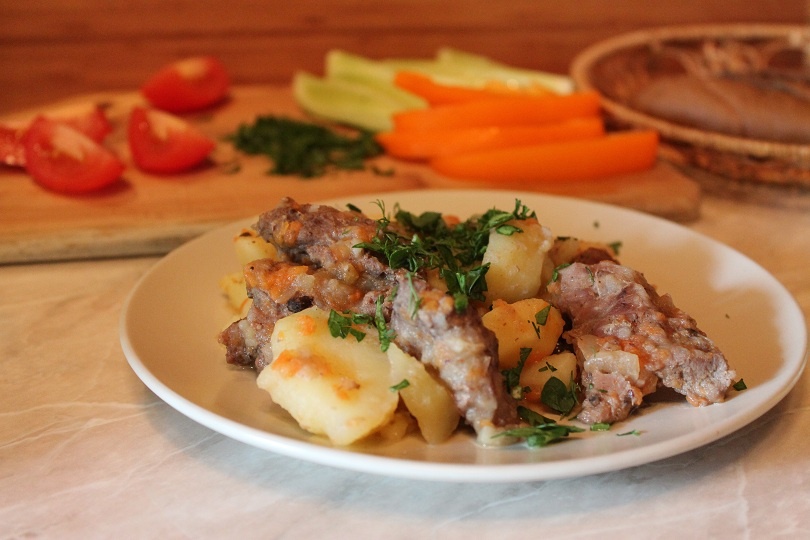 Обычное блюдо из серии закинул и ушел. Картошка с мясом - что может быть проще? Предлагаю два варианта. Первый. Программа Тушение 1ч 20 мин. Мясо можно подготовить заранее, хоть утром на вечер, хоть вообще за сутки. Порезать его на кусочки, добавить приправы, посолить, поперчить, налить растительного масла и нарезанный репчатый лук. Пряности я брала такие: кориандр, прованские травы, мускатный орех, ягоды можжевельника, гвоздика, паприка, орегано, перец чили, черный перец - истолкла в ступке. Конечно, можно брать любую готовую смесь приправ. Мясо, пряности, масло, соль, лук в миску - перемешать. Можно сразу положить на дно чаши мультиварки, можно оставить в холодильнике мариноваться (хоть 1 час, хоть 1 сутки) Мясо переложила в чашу мультиварки, а в эту миску из-под мяса положила картошку и морковку, посолила, перемешала. Выложила в мультиварку поверх мяса. Важный момент для программы Тушение - на дне чаши мультиварки должен лежать продукт, который при нагреве быстро даст сок (вы