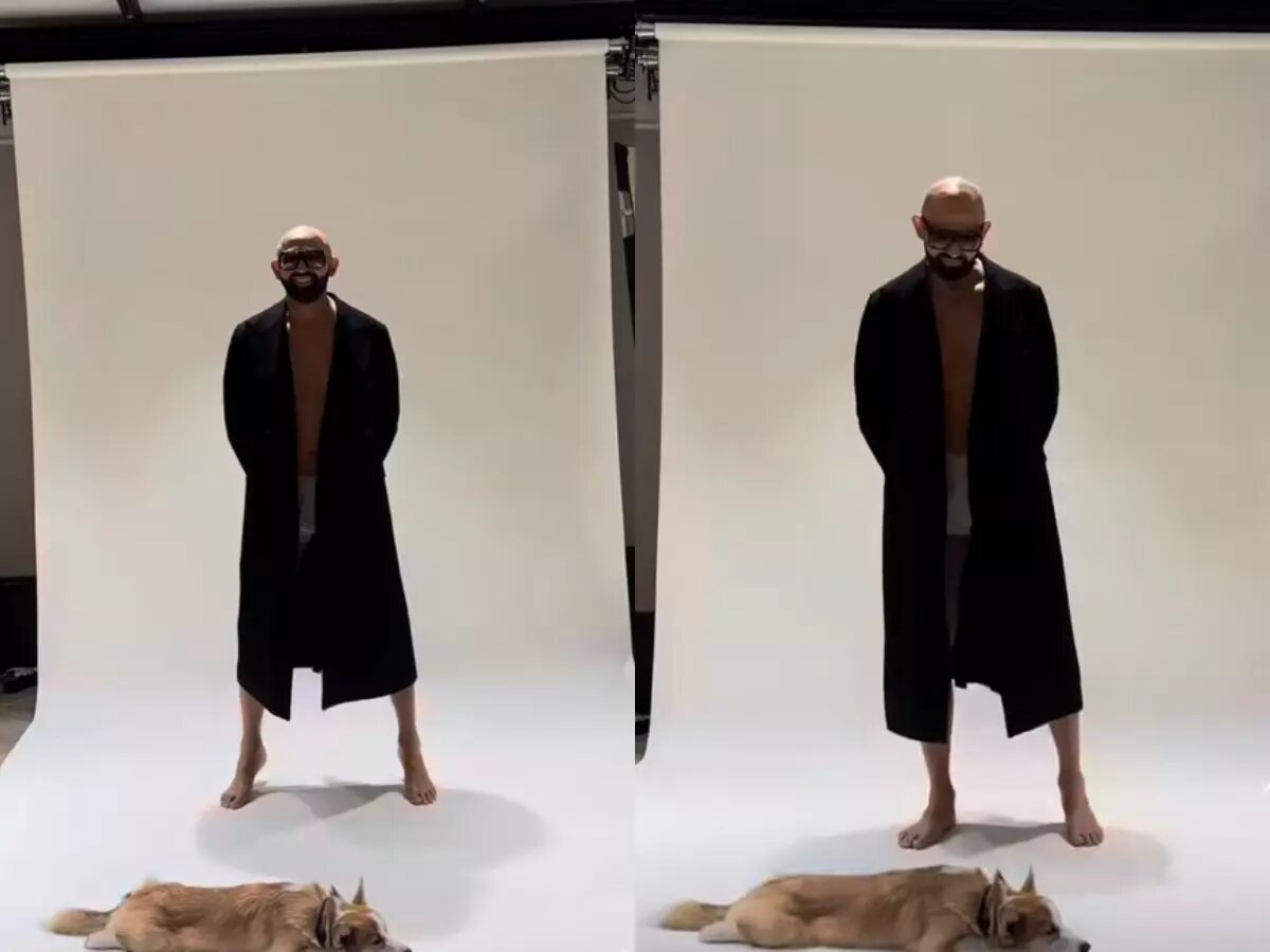 В кадре бизнесмен надел длинное черное пальто поверх почти голого тела. На Николае остались лишь белые трусы. На лице как-всегда красуются фирменные массивные очки.