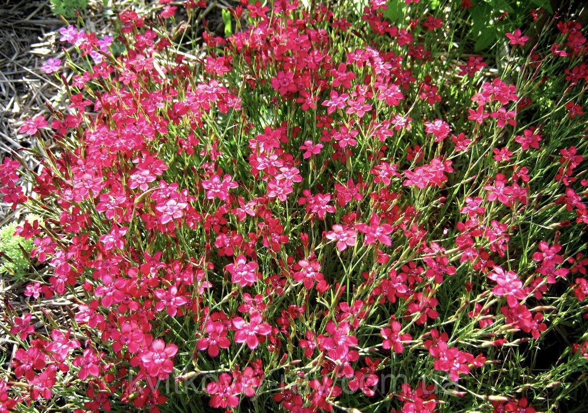 Эффектная многолетняя гвоздика формирует мягкую аккуратную подушку, пышно цветущую в летнее время и сохраняющую зеленую окраску листвы зимой. Вечнозеленые листочки и небольшие цветки с бахромчатыми лепестками отлично подходят для хорошо освещенных бордюров и альпинариев.