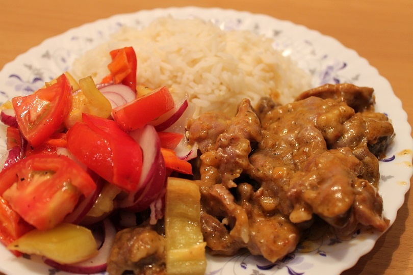 Как говорится "элементарно, Ватсон", сначала куриные желудки обжарила на Жарке, потом потушила их. Тушить, чувствую, что вы мне подсказываете, на Тушении, совершенно верно. Или, если есть МастреШеф, то можно прямо на Жарке, не переключаясь на Тушение, уменьшить температуру. Рис варила на Рис/Крупы. По-хорошему, в другое время я бы использовала две мультиварки - в одной рис, в другой желудки. Но в этот раз варила всё в одной попеременно. Сначала желудки, потом вынула чашу с ними, установила другую чашу и сварила в ней рис. Дальше вынула чашу с рисом и обратно установила чашу с желудками - пока раскладывала по тарелкам рис и салат, желудки подогрела в мультиварке. А теперь подробнее о "жонглировании" двумя чашами. Продукты: куриные желудки 2 упаковки общим весом немного больше 1 кг Луковица Мука 1 ст.ложка без горки Сахарный песок 1 ст.ложка без верха Кетчуп - по вкусу, примерно 3-4 ст.ложки Приправы для курицы Соль, перец молотый Растительное масло для жарки Подготовила куриные ж
