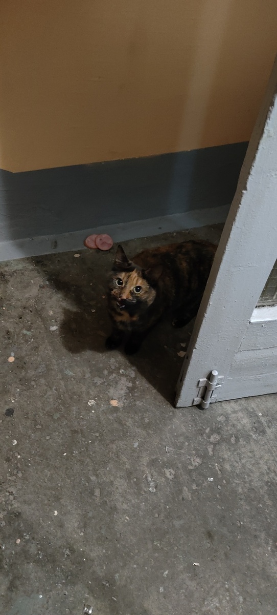 Опять обошёл всё что можно. Нашёл её. Лежит на полу, явно не дворовая, забилась в угол, мяучит, словно плачет. Ручная, но боится близко подойти. Либо болеет, либо, что скорее всего замёрзла.