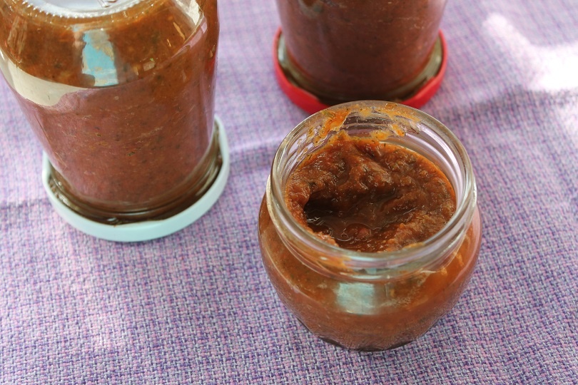 Рецепт этой закуски я сделала по мотивам рецепта кетчупа. У меня упрощенный вариант, не рассчитан на долгое хранение, я сварила "на сейчас", может храниться в холодильнике примерно месяц. Для длительного хранения обычно варят большую порцию, которая в мультиварке не поместится. Основной принцип рецепта "на зиму" почти не отличается от того, что я вам сейчас приведу. На зиму просто нужно еще раз довести до кипения уже пюрированный кетчуп и расфасовать его в стерильные банки со стерильными крышками (по ходу дела сделаю акценты для кетчупа длительного хранения). Моя закуска получилась густой, гуще, чем должен быть кетчуп, потому что овощи я откинула на дуршлаг и сцедила часть жидкости. Я сделала густой кетчуп, но можно и жидкий тоже. Это на любителя. И цвет моего соуса совсем "некетчупный", потому что кетчуп красный. Для красного цвета нужно брать болгарские перцы только красного цвета. Я же взяла какие были. Рецепт кетчупа, а, по сути, эта овощная икра. Да, да... Строгие пропорции приво