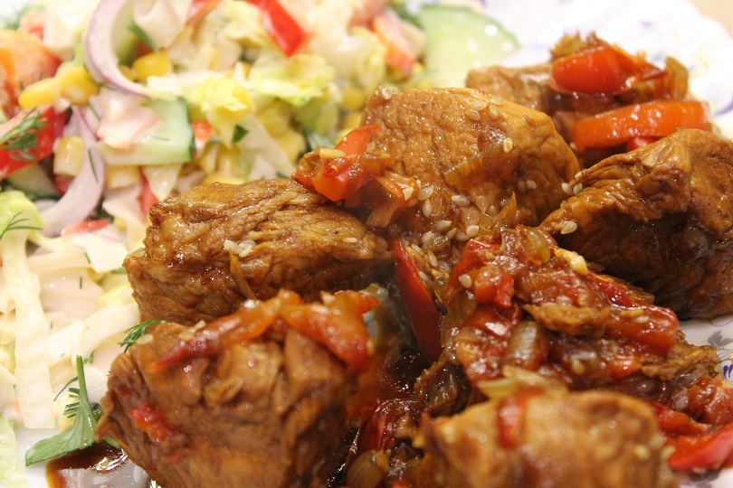 - кусочки мяса жарятся, не то чтобы жарятся как стейк, а просто постепенно меняют цвет на вареный